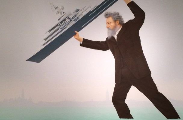 It proves to be the perfect setting as Deller clearly drew much inspiration from Morris, a nineteenth century utopian socialist who also did a nice line in wallpaper and poetry. Indeed, the main piece of the exhibition is mural of Morris emerging colossus-like from the sea and holding aloft Roman Abramovich’s luxury yacht, Luna, in a manner suggesting it is destined for a watery grave in the Venice lagoon. This, apparently, is retribution for bad parking: Abramovich took the Luna to Venice last year but was no doubt oblivious to the fact that his ship is so big that it blocked the view for many visitors to the Biennale and a security fence erected around it restricted the use of the promenade by other visitors and locals alike.