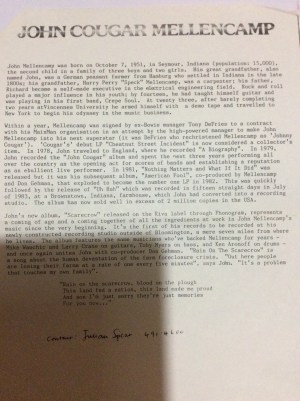 What I had forgotten, however, was the little treasure inside the album sleeve – a thin piece of A4 paper with a type-written biography of John Cougar, below which is the biro-scrawled phone number of Mellencamp’s publicist. As the blurb explains, the lyrics of Scarecrow are indeed autobiographical, or at least influenced by Mellencamp’s own upbringing in Seymour, Indiana, on the farm built by his great grandfather – a German peasant who made the trip west to build a new life in the late nineteenth century.