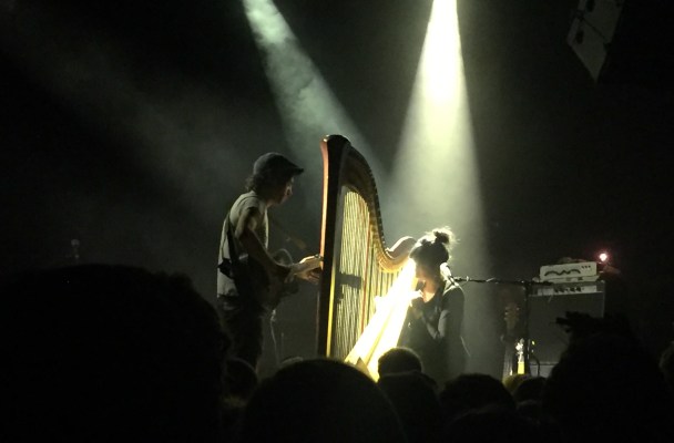 The core of the band, as I now understand, are the aforementioned brothers, Andrew (drums) and Brad (singer-songwriter), along with harpist Sarah Page. In Brooklyn, however, they were joined on stage by variously a double-bassist, slide guitarist, pianist, trombonist, saxophonist and trumpet player. Not content with this, Brad changed his guitar every song, alongside dealing out some mean harmonica and doing something weird involving pulling a guitar string like a magical thread.