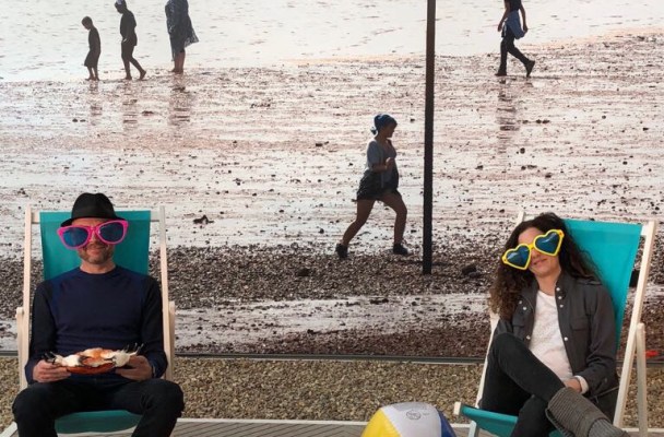 Elsewhere, an older man looks down in disdain on a snogging couple taking advantage of a little privacy behind a beach shack.