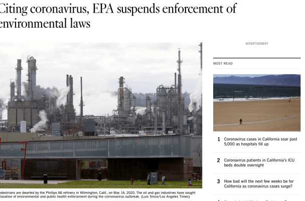 Most of these people are not in power, however, while the elected leader of the most powerful democracy on Earth, Donald Trump, is systematically ignoring scientific advice, including using the Covid-19 crisis to suspend enforcement of health and environmental regulations (Citing coronavirus, EPA suspends enforcement of environmental laws, Los Angeles Times, 27 March). As Gina McCarthy, a former Obama-era Environmental Protection Agency chief put it: “No one has ever seen anything like this. This is a complete pass for every industry.”