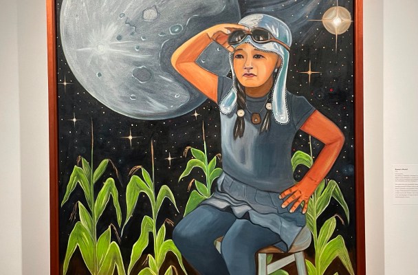 My favourite piece of all, ‘Raven’s World’, stars Niro’s grand-daughter confidently surveying the future in her aviator cap (an allusion to Sky Woman – the superhero mother of all Haudensaunee), sitting amidst robust looking crops and backed by a full moon symbolising grand-mothers and the hope that the Haudensaunee’s matriarchal culture will survive and thrive.