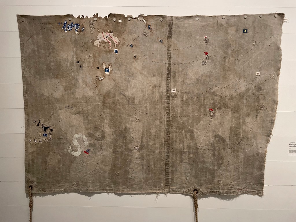 ‘The Move’ uses a different kind of map and exudes a more military vibe. Using a battered piece of army tent as a canvas, Marakatt-Labba has embroidered the route of a forced human migration across the embroidered contour lines of Giron, the artists’ former hometown, which is now subsiding into the mines which extracted mineral wealth at a cost of habitation.