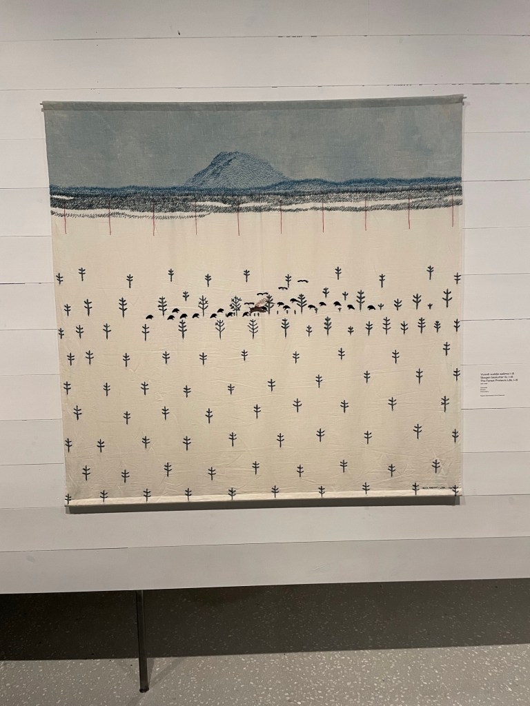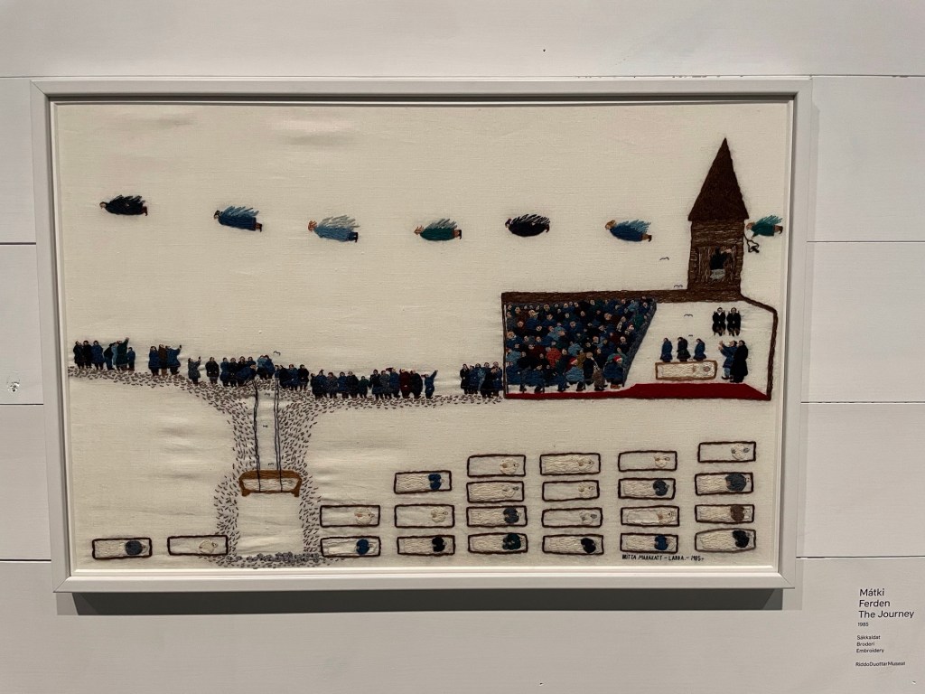 The figurative and literal centrepiece of the exhibition is the monumental ‘History’ – a 24 metre long continuous piece of embroidery detailing the myth, dream, and reality of Sami history. Housed in a rotunda, gallery visitors can follow its story from any starting point, I guess reflecting the non-linear appreciation of time in Sami culture. This is the Bayeaux Tapestry on an Arctic landscape and charting stargazers, hunters and protestors rather than military combatants.
