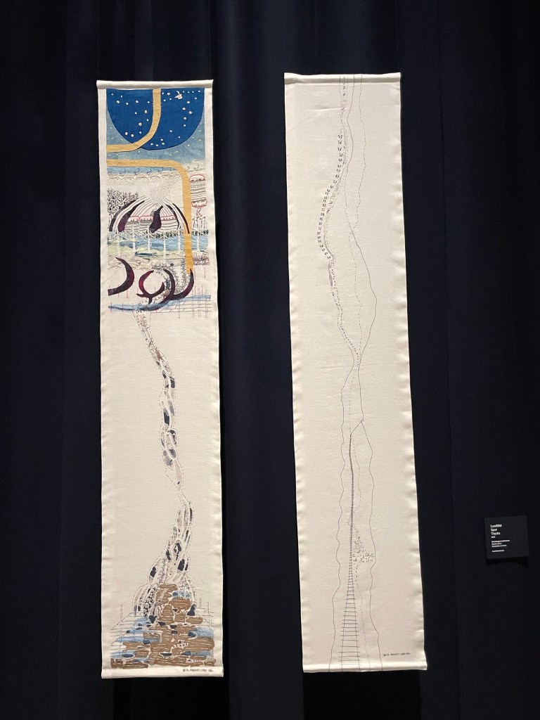 Sami artist, Britta Marakatt-Labba, campaigns for environmental protection and indigenous rights in Norway through the medium of embroidered landscapes and maps of epic beauty and subtle detail. The two hours I spent viewing a large retrospective of her work – ‘Moving the Needle’ – at the Nasjonal Museet in Oslo last weekend counts as my most enjoyable 2 hours wait for a hotel check-in. Sometimes delay really does generate pleasure.