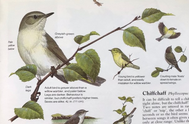 To describe the song in more detail I will defer to the birdwatching bible my Grandma bought me in 1984 – anticipating by a good 30 years that I would become a birdwatcher. “Two notes are uttered in random order: one a high-pitched “chiff” or “tsip”, the other a lower “chaff” or “tsap”. After 75 seconds or so the bird seems to fall silent, but in the intervals between songs it often gives a soft, chirring call that is audible only at close range. Unlike the Willow Warbler, it likes to sing from high in a tree.”