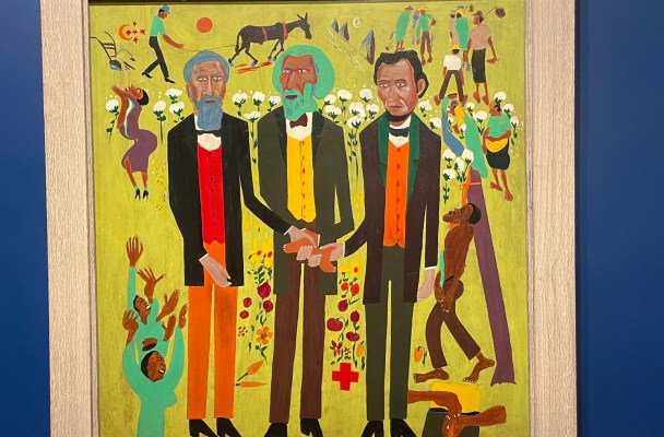 Robert H. Johnson’s ‘Three Great Abolitionists’ unites Abraham Lincoln, John Brown and Frederick Douglas in a hand-clasp that eluded these three leaders of the abolition of US slavery in their lifetimes. It is an arresting start to a rousing exhibition at the Smithsonian American Art Museum in Washington D.C. – all vibrant colours and stylised imagery in celebration of freedom fighters, liberationists, emancipators, socialists, mostly American people of colour.